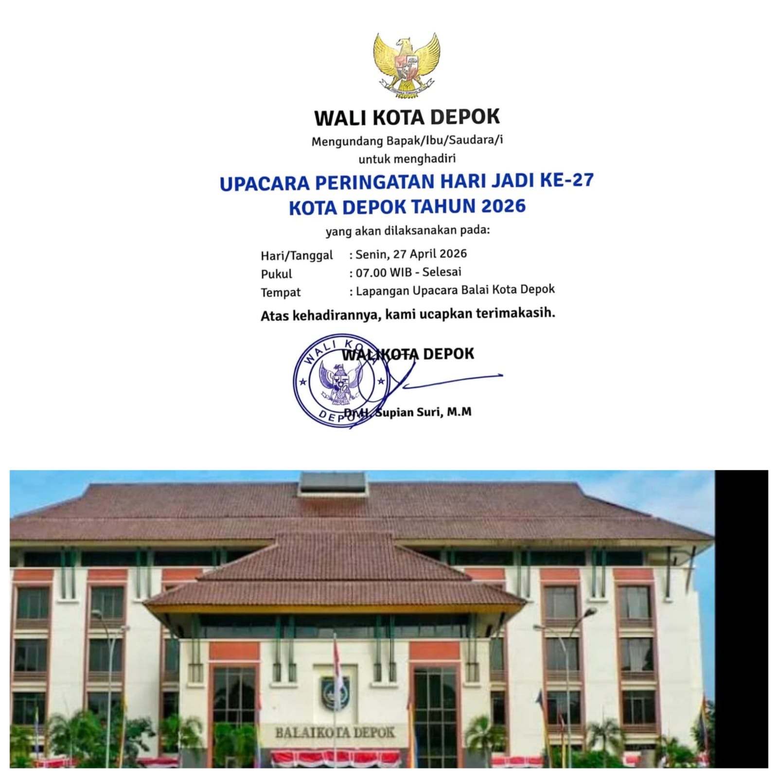 Menurut SWD, upayanya untuk ke ruang Pesta tersebut dalam Rangkaian kegiatantan HUT Ke-27 Kota Depok, usai Upacara Pagi SENIN 27 April 2026, Karena adanya Pemberitahuan Surat Undangan Resmi dari Walikota Depok Supian Suri,Hari, tanggal Senin, 27 April 2026 sudah jelas,