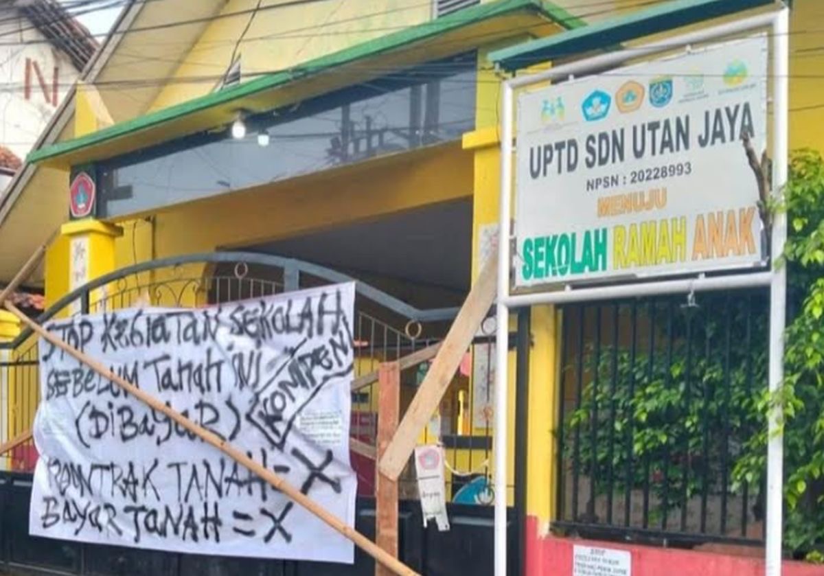 DEPOK – produktifnews.com /Pagar SDN Utan Jaya yang berlokasi di Pondok Jaya, Cipayung, Depok dipalang balok kayu dan bambu serta spanduk yang berisi pesan dari ahli waris lahan sekolahan atas nama Alm. H. Namid Sairan pada hari pertama sekolah pada Senin 6 Januari 2025.